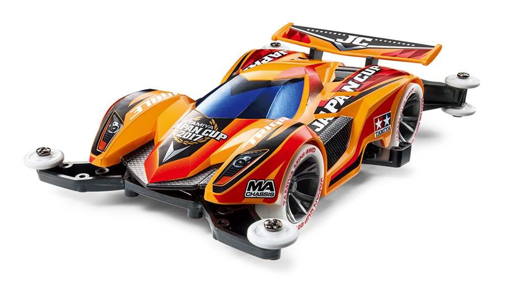 This is a special limited edition of TRIGEILE with a charming full-car style. Body is made of orange color ABS resin. Metal tone dedicated sticker which arranged JAPAN CUP 2017 logo is also noteworthy. The MA chassis with double shaft motor mounted in the center of the car is black color. The white tire to be attached to Silver color A spoke wheel is hard low height type with red print. ★ A parts such as rollers, rear skid bars and gear covers are made of white colored low friction resin. ★ Rear skid bar and side stay are also standard equipment. ★ 3.5: 1 with super fast gear.