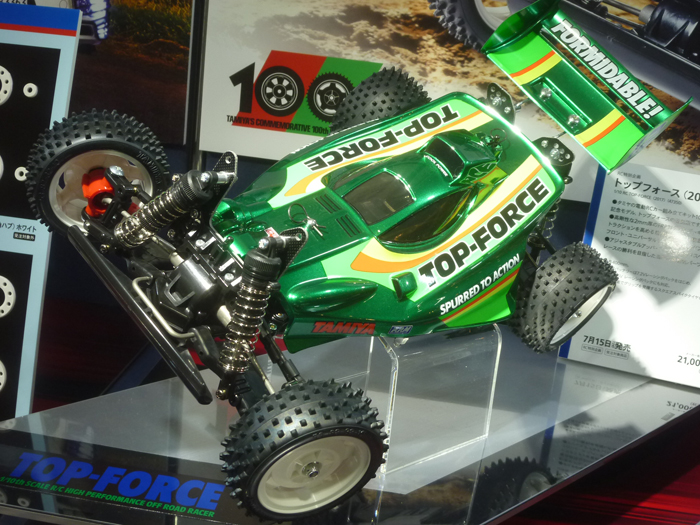 This is a reprint version of Tamiya Electric RC Car Assembly Kit 100th issue commemorative model, Top Force. High rigidity 2 mm thick FRP double deck frame, front and rear ball differentials for increasing traction, front and universal shafts for suppressing drive loss, suspension with adjustable upper arm equipped with oil damper, etc. at that time, aimed at winning the race It is full of parts.