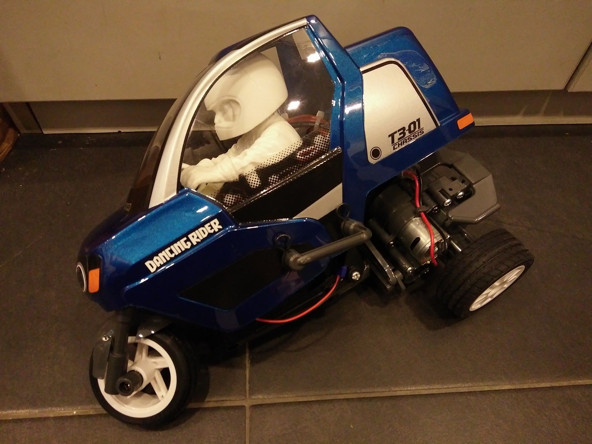 Detail photos of kit box, manual, built and chassis of Tamiya 57405 1/8 R/C Dancing Rider (T3-01)