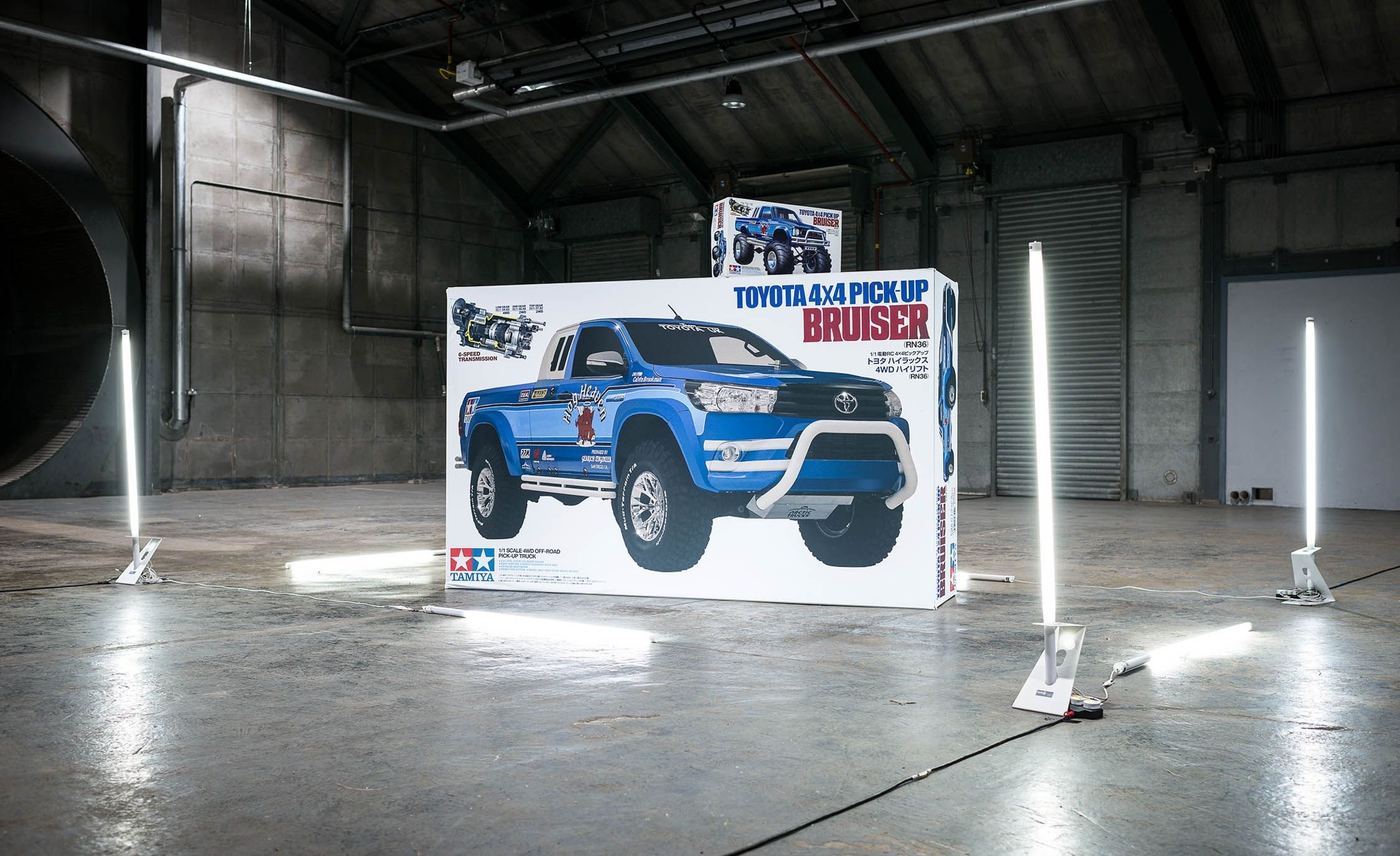 During the 1/10-scale, off-road RC boom of the 1980s, toymaker Tamiya’s bread and butter came from the demand for such memorable machines as the Frog, Grasshopper, Fox, Hornet, and Blackfoot; but the company also sold more mechanically advanced radio-controlled cars, like its all-wheel-drive Porsche 959 replica and, of course, the Toyota Hilux–based Bruiser, a metal-framed beast with a leaf-spring suspension and a three-speed gearbox. In a fit of nostalgia, Toyota commissioned a full-size replica of the radio-controlled pickup based on its current Hilux offering.