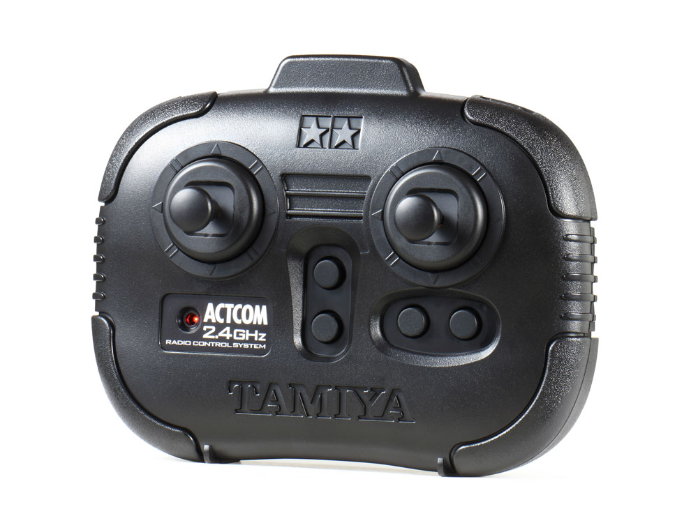 - Dedicated transmitter of stick type. Left stick controls forward and reverse and left and right turn.