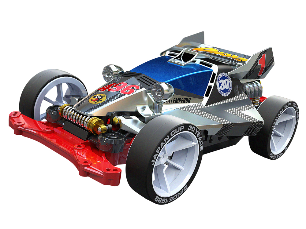 2018 marks 30 years since the first running of the Japan Cup back in 1988, and this model is on hand to make it an anniversary to remember! In fact, the Emperor was the car used to publicize both the 1st and 2nd Japan Cups, so it is an extremely fitting choice. Here, it appears as a special model with gorgeous silver color metal plated body and dedicated stickers. It is based upon the MS chassis, with red and black sections, 6-spoke wheels, and super hard low-profile tires with sidewall lettering.