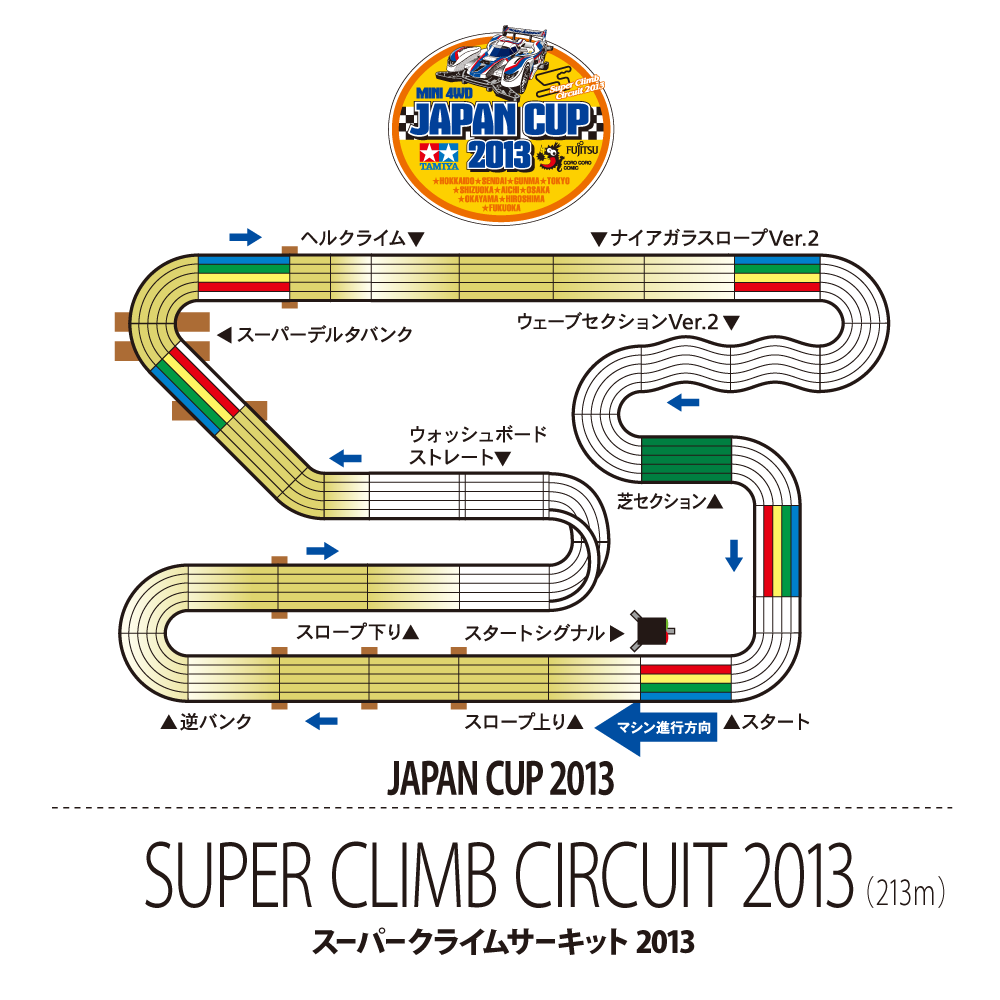 From 2016, participation in open class is based on a pre-registration system based on the smartphone application “Tamiya Passport”. The official course “Ultra Burning Circuit 2016” is a complex section “Double Dragon” with two consecutive dragon bags, a three-dimensional section “The Alps” with a different height that imaged the Alpur mountain range, stands vertically at a height of about 170 cm Changer “Vertical changer” and other difficult sections were composed. In addition, from this year the cap brand New Era supported the champion cap, the corner “New Era turn” with its name, and the machine section that reached the top speed rushes into the complex section of the continuous S-shaped curve “Fujitsu Triple Sponsors section such as “S.” appeared. The Japan Cup holding commemorative “Raikiri Japan Cup 2016” was also released.