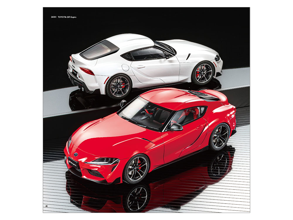- 1/24 sports car series is Toyota GR Supra. Lined up two units of white and red. The dynamic curved body is excellent even in the model.