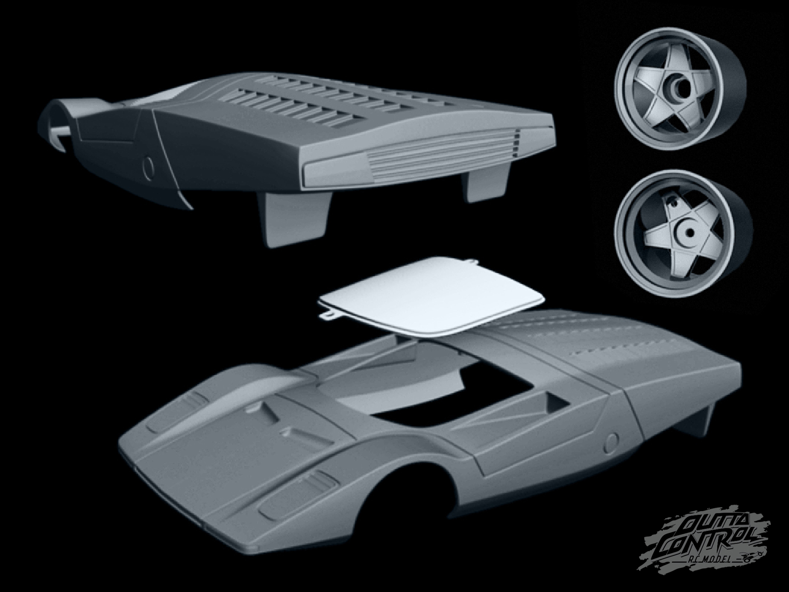 printed in a mix of resin and ABS material and the windshield was printed in clear resin. The wheels were also printed from resin/ABS. The special wheel nuts are special production made from aluminium.