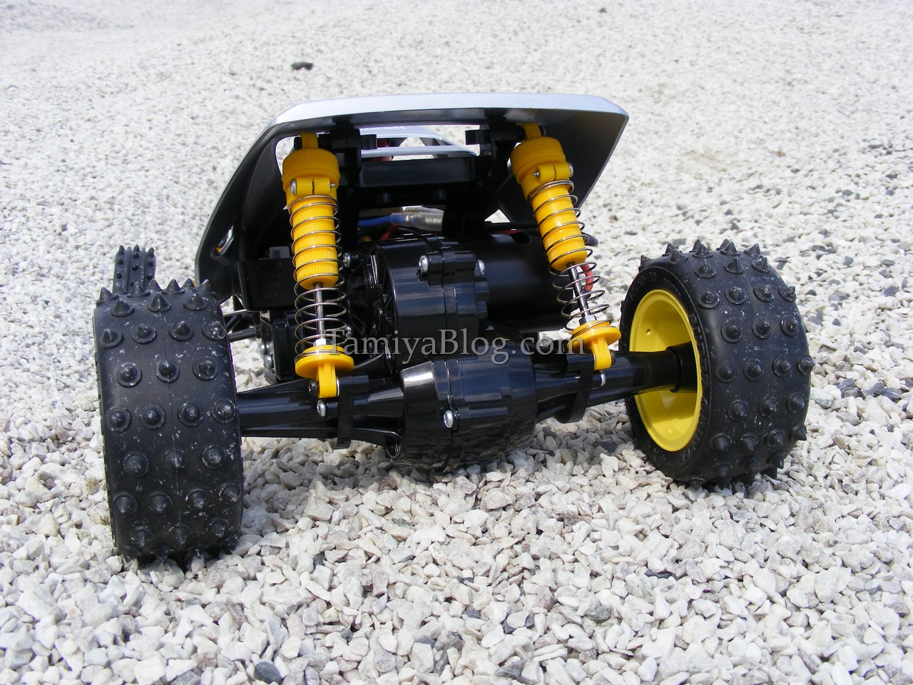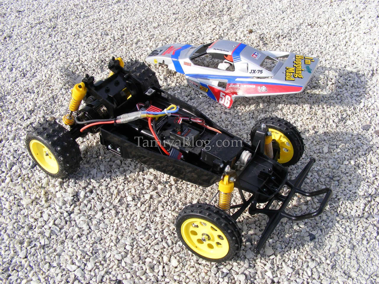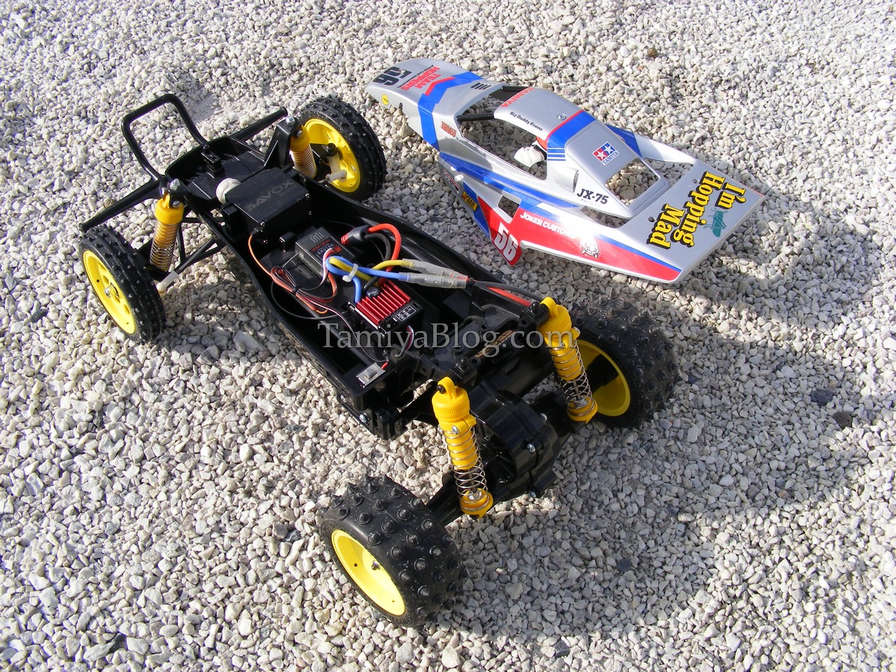 The Grasshopper II. Back in the days, the Grasshopper II was not really my cup of tea. But today i see it from another point of view. Especially the “Super G” version, which was available on some markets is a really cool car. So, the plan was to re-create that version. The “Super G” came with a 540er motor instead of the stock 380 motor. Friction shocks were also changed to the cool C.V.A. ones. Yellow Fox/Wild One style wheels and Avante/Supershot Spike tires for the rear and Super Hornet style front pin spike tires. The tires, shocks, and motor (we used a 540 Black Sport Tuned) weren´t really a problem. But the yellow wheels aren´t impossible to find nowadays. So we made our own using the classic Tamiya Nylon Parts Coloring Set No. 53130. The wheels came out very well. Tamiya TS-76 Mica Silver was used for the body, to give the buggy a more professional look. With the modern ESC, Sport Tuned motor, and digital servo, the “Super G” is a really good performer for such an basic entry level car.