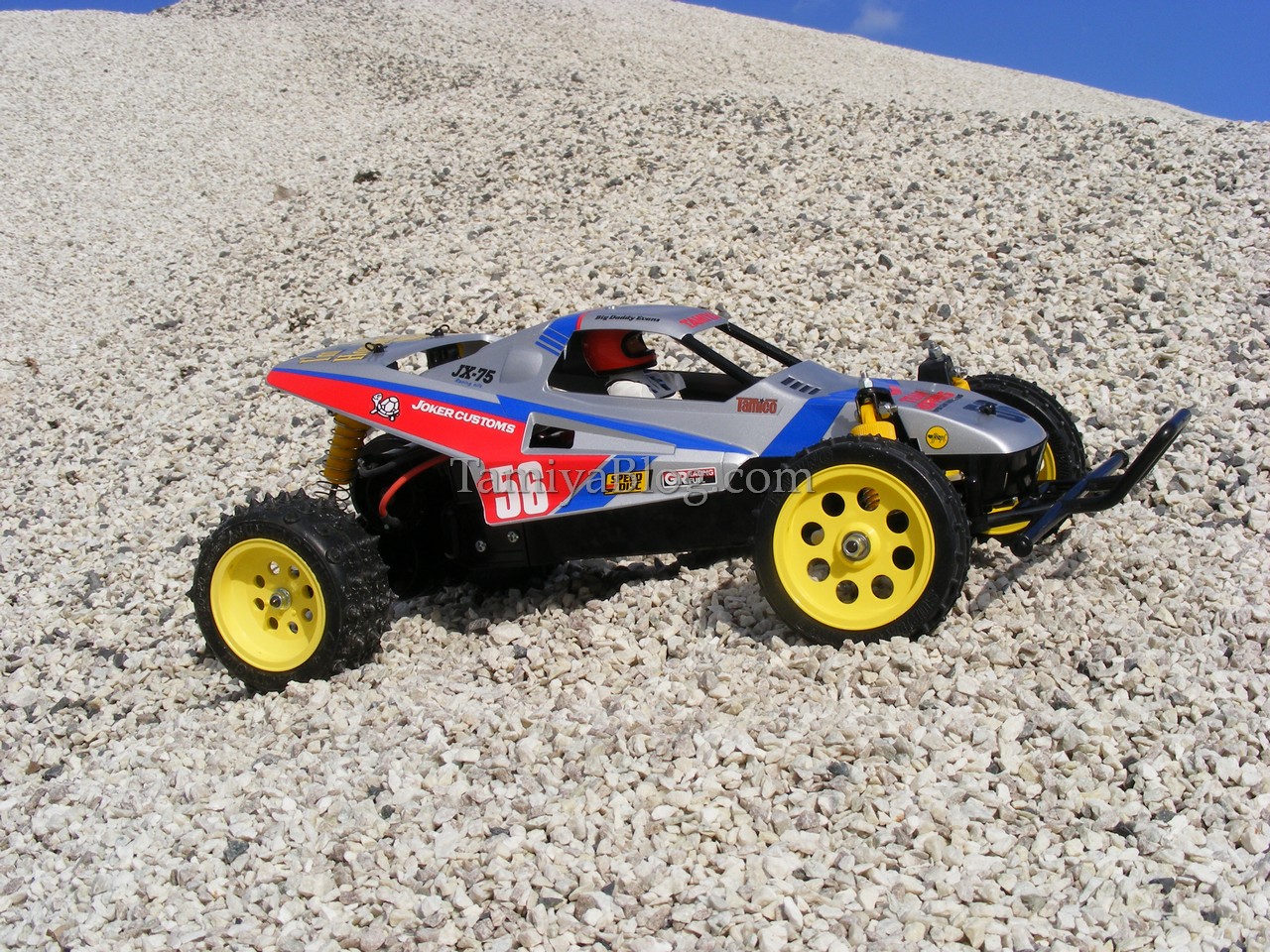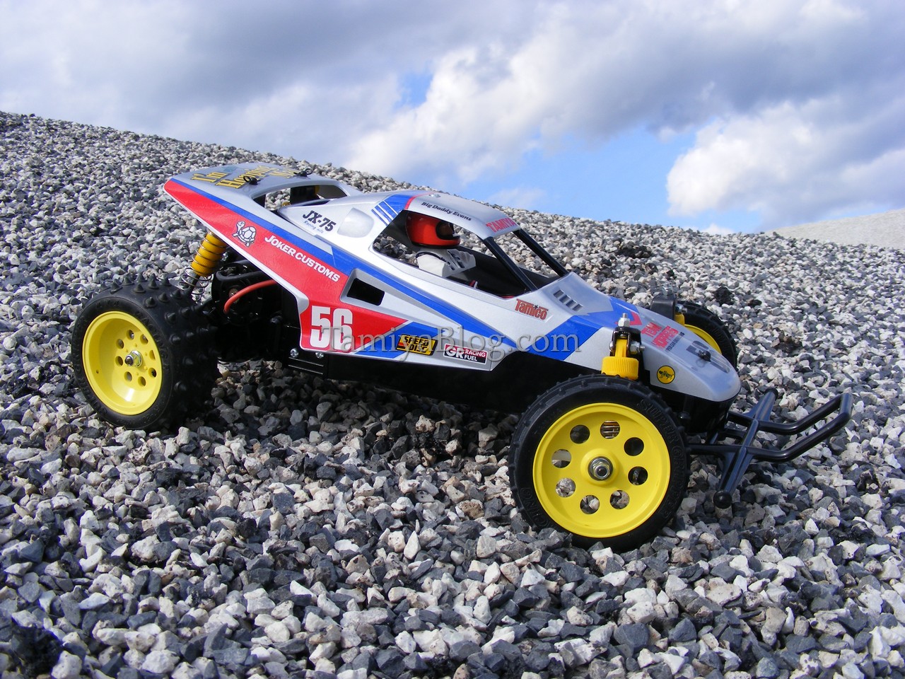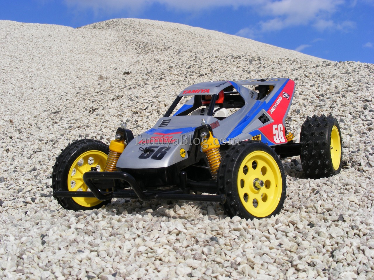 The Grasshopper II. Back in the days, the Grasshopper II was not really my cup of tea. But today i see it from another point of view. Especially the “Super G” version, which was available on some markets is a really cool car. So, the plan was to re-create that version. The “Super G” came with a 540er motor instead of the stock 380 motor. Friction shocks were also changed to the cool C.V.A. ones. Yellow Fox/Wild One style wheels and Avante/Supershot Spike tires for the rear and Super Hornet style front pin spike tires. The tires, shocks, and motor (we used a 540 Black Sport Tuned) weren´t really a problem. But the yellow wheels aren´t impossible to find nowadays. So we made our own using the classic Tamiya Nylon Parts Coloring Set No. 53130. The wheels came out very well. Tamiya TS-76 Mica Silver was used for the body, to give the buggy a more professional look. With the modern ESC, Sport Tuned motor, and digital servo, the “Super G” is a really good performer for such an basic entry level car.
