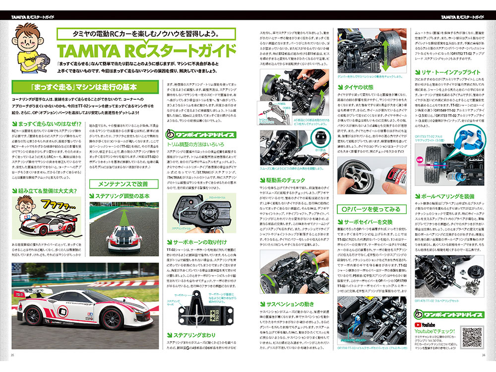 This is Tamiya RC Guidebook Vol.15, which carefully selected and published Tamiya’s major RC models. The cover is decorated with a new model of 4WD chassis, Comical Avante, which has been added to the increasing popularity of Comical RC cars. A model with plenty of nostalgia and cuteness. Of course, classic touring cars and formula cars that are attractive for high-speed driving, off-road cars that can be run anywhere, tanks and trailer trucks with big size are powerful, 3 wheel RC where cornering with fun tilting the car, out of the box Includes Tamiya’s major RC models such as the ready-to-play completed model XB. In addition, we’ve posted some of the hot new products that will be released by this summer. You can also enjoy RC movies by printing the popular QR code and jumping to the Tamiya website using your smartphone or mobile phone. RC Beginner’s must-see RC start guide explains the basic “run straight” machine for running. In addition, there are a lot of pages that will be useful for fans who are going to start RC, such as guides for race participation and introduction of the popular “Try!! Tamiya RC School”. At the end of the book, we also introduced hobby shops nationwide and Tamiya’s RC circuit. All color A4 size, 38 pages with plenty of volume.