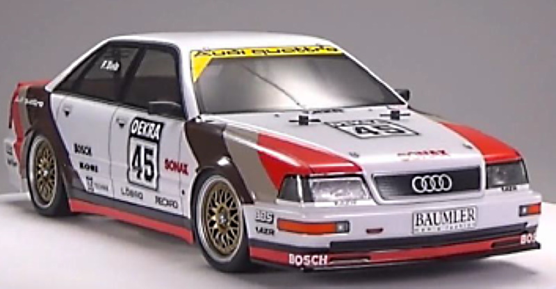 Tamiya is delighted to announce the appearance of another classic racing car on our popular TT-02 chassis, this time the Audi V8 touring car with a 456hp 3.6-liter V8 which graced the DTM (Deutsche Tourenwagen Masters) in 1991. That season, it took four victories overall and carried Frank Biela to the drivers’ title.