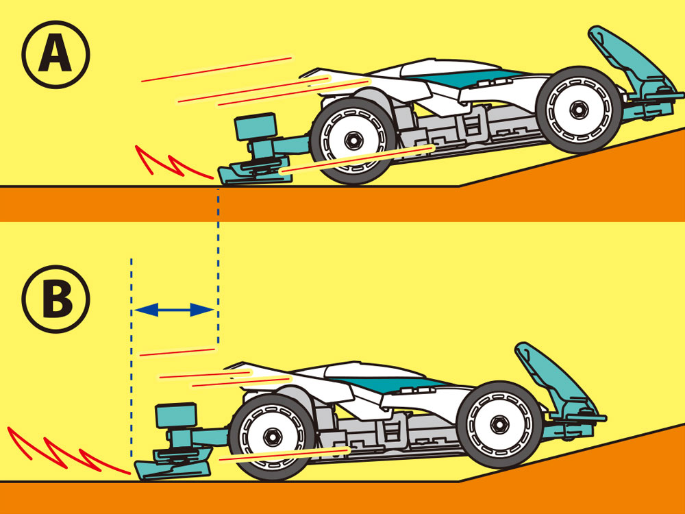 The “rear brake” that prevents the course from going out by slowing down the speed when the brake touches the ground when entering an uphill has two specifications, A and B, which have different angles when the spacer is installed in the opposite direction. You can choose and adjust the braking force.
