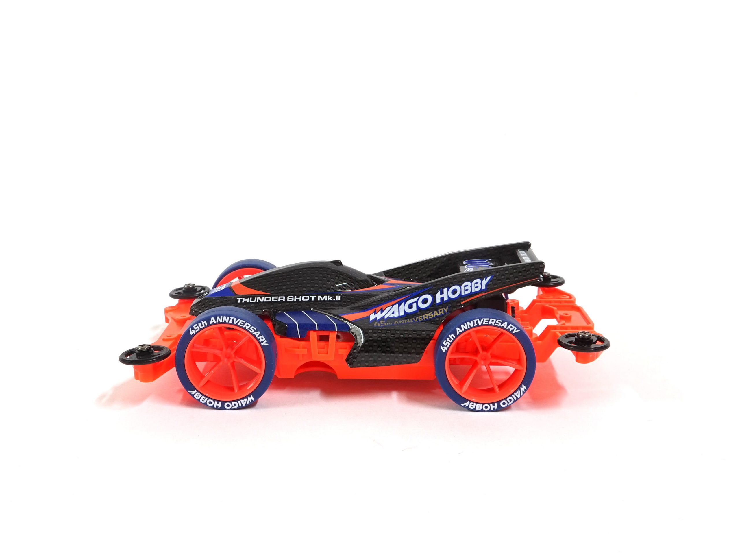 The first limited product is “Thunder Shot Mk2 Waigo Hobby 45th Anniversary Special” (article number: 92429), with a carbon fiber patterned soft body shell and a fluorescent orange MS mid-mount chassis, plus a special TAMIYA The designed body stickers and dark blue tires are matched with a strong contrast. The rarity of its accessories is believed to be a favorite for car fans!