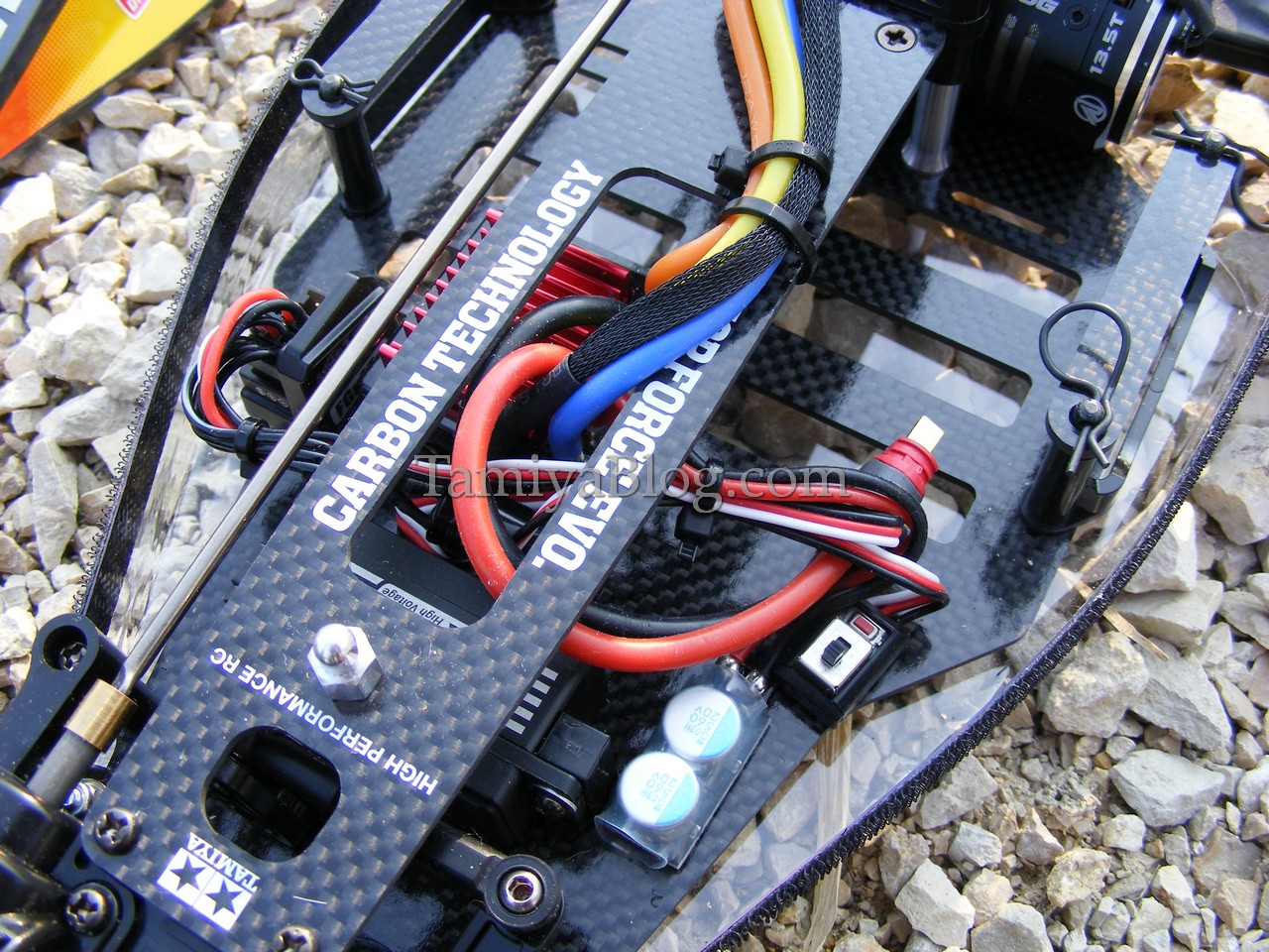 The “normal” Top Force was a good car, although it actually got by with relatively very common TA-01 technology. As a good driver with a well built “Top Force”, you definately had a chance, also in higher class races. But the “Top Force Evolution” went one better in all areas. Carbon plate chassis, Ball differentials front and rear, universal joint shafts for front and rear, steel cardan shaft, a full set of ball bearings, and last but not least the fantastic aluminum dampers, which are still absolutely competitive today.
