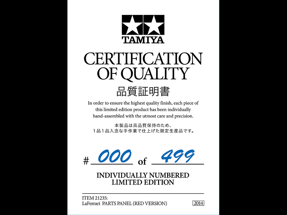 Precisely reproduced scale model parts are carefully painted one by one and laid out without assembling. I pulled out the charm of the mechanism to the fullest and put it in a full-scale frame. In addition, Tamiya stickers are embedded in the side of the frame, which is moated by NC processing, and the aluminum name plate creates high quality. The “Parts Panel Collection” has a high-quality finish that can be used not only as a decoration on the wall of a room but also as a decoration for a store.