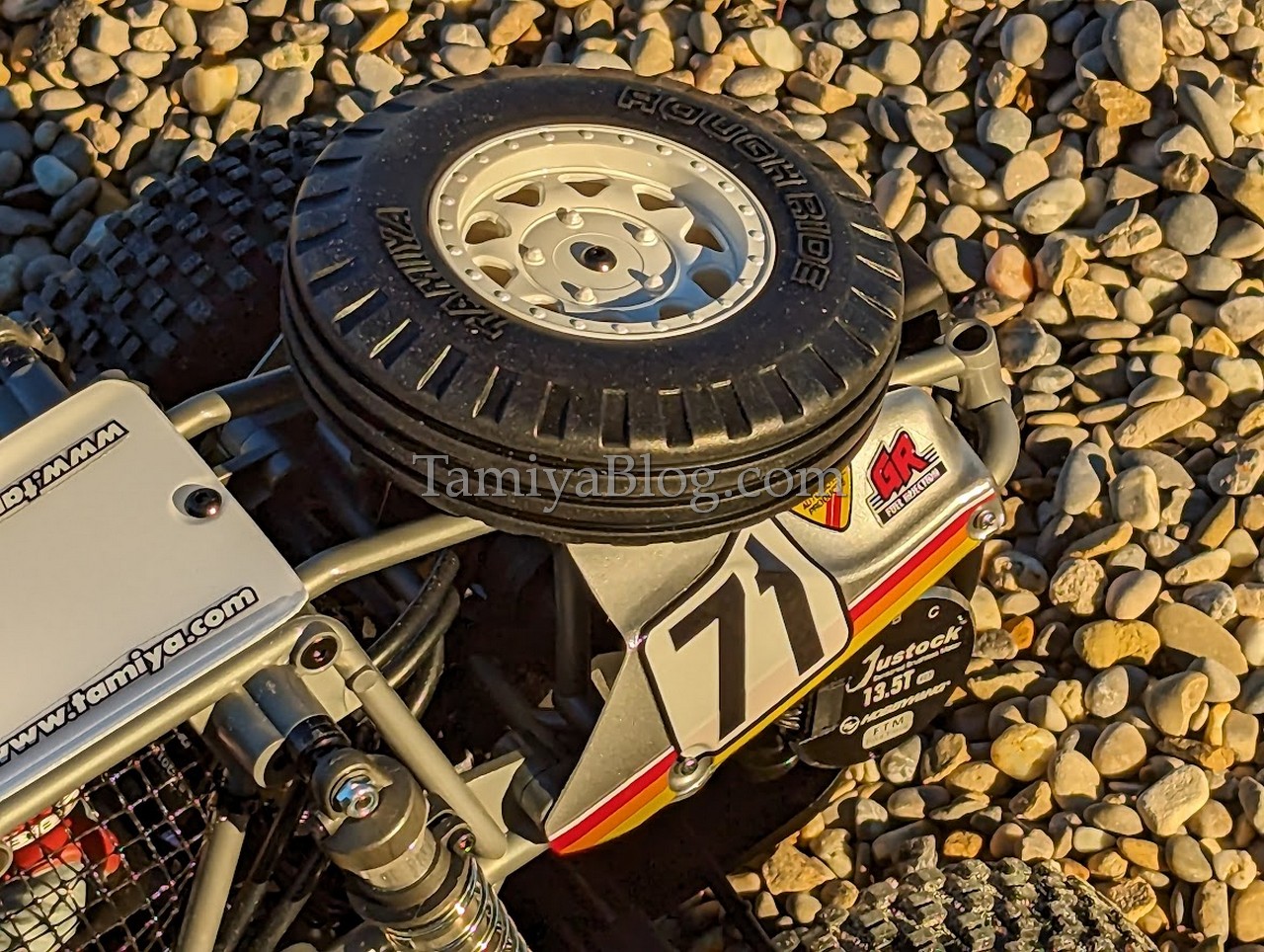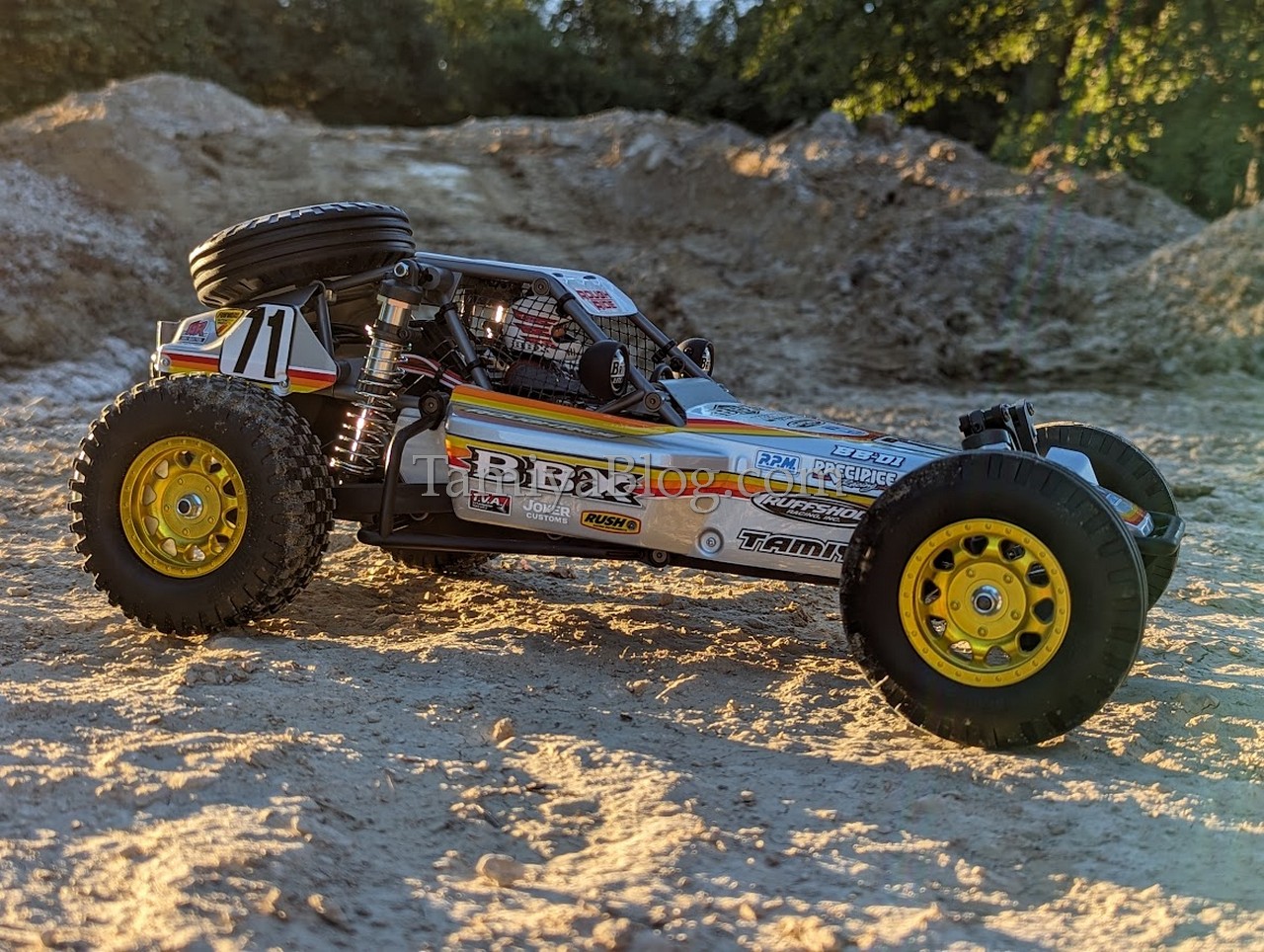 To make it short. Building the BBX gave me great pleasure. It actually compares well with building a classic Tamiya SRB buggy kit. The construction of the tubular frame is very well thought out, as is the wonderfully designed body made up of several parts. If the willing builder makes an effort here and also paints the driver figure borrowed from the Tamiya “Fox” nicely, he will be rewarded with a beautiful model that not only looks good but also drives excellently. For our own BBX we chose a classic Tamiya PS-12 Silver. We also painted the original chrome-plated rims with Tamiya LP-69 clear yellow. Technically, only the optionally available 22071 slipper clutch was installed. After completing the model I was really impressed and really had the feeling that I had a very special model standing in front of me.