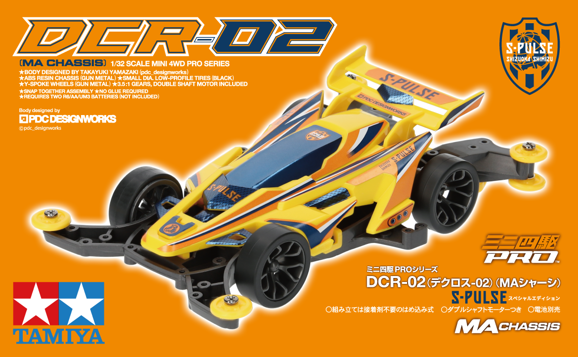 This is a four-wheel drive plastic model assembly kit with high performance and fun racing. DCR-02 (Decross-02) is one of the Mini 4WD PRO series that uses the “Cross System”. The chassis (vehicle body) uses a high-performance MA chassis. “MA” is an abbreviation for MidshipAERO. The double-shaft motor is mounted in the center of the vehicle, resulting in excellent drive efficiency and weight balance, and the underside of the vehicle has been designed with consideration to airflow (aero) while driving, resulting in excellent aerodynamic effects. The S-PULSE Special Edition is now available, allowing you to customize the DCR-02 to S-Pulse specifications. The exterior is also an S-Pulse original sleeve.