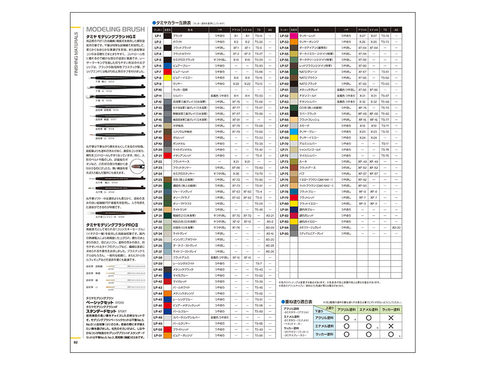 - A compatibility chart for Tamiya colors is provided. Based on lacquer paints, you can see at a glance which acrylic paints and spray paints correspond to each color.