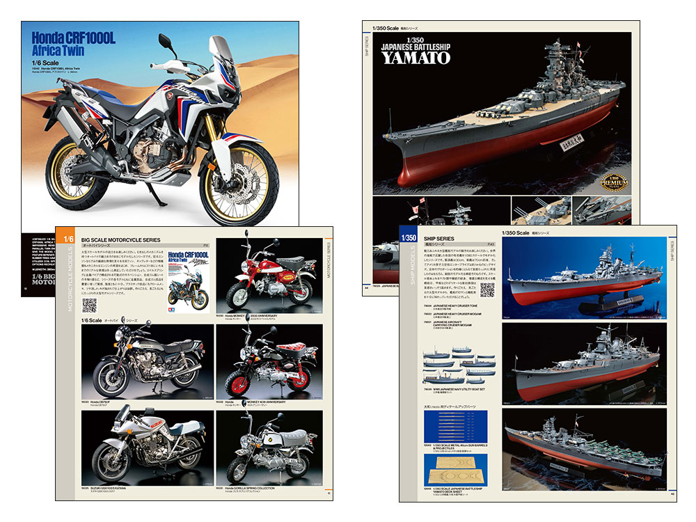 - Big-scale models such as the 1/6 Honda Africa Twin and 1/350 Yamato are introduced with large-format photographs that convey their presence and power.