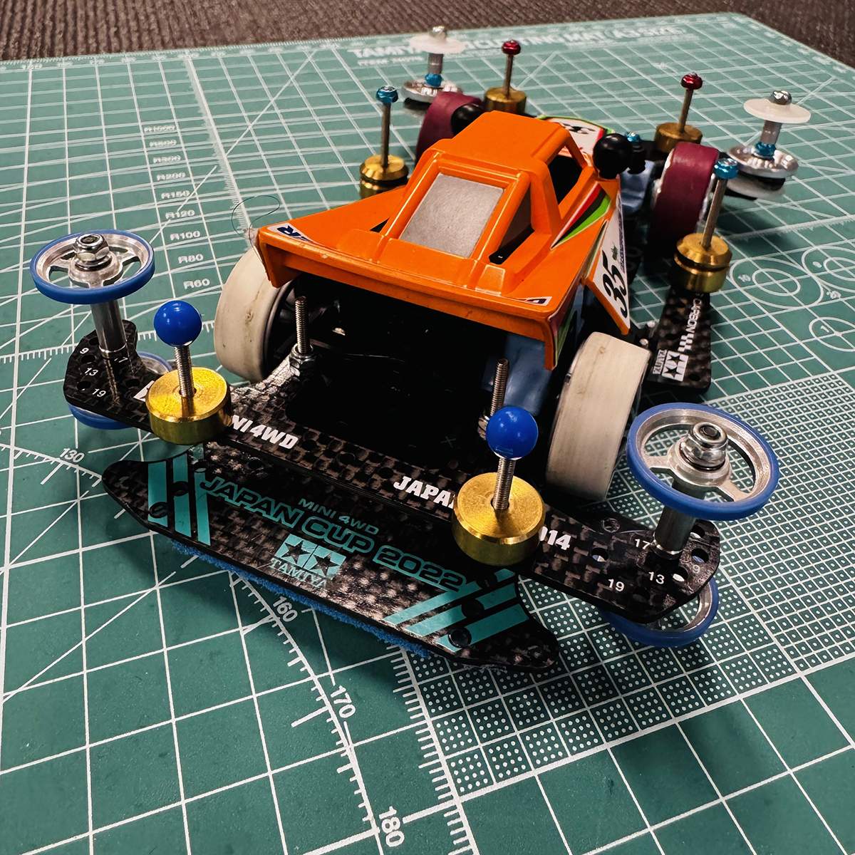 Our customer service supervisor is no stranger to Mini 4WD racing as he has been involved in the hobby for many years. Most recently, he has taken the recent release of “The Grasshopper Jr.” (item 18105) and turned it into a winning race machine that was entered into the ADVANCED CLASS at a local Mini 4WD shop in Fullerton, CA. Dukwho Workshop