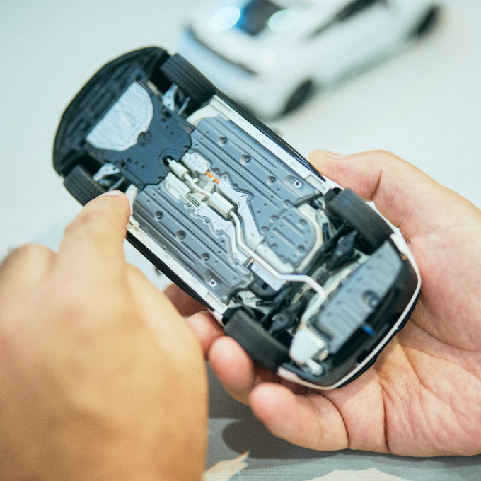 Ishiguro: I had heard the thoughts and stories of the people who developed the actual car, so I did my best to live up to their enthusiasm (smiles). But the most difficult part was the undercarriage. It was hard because we didn’t have the actual car in the early stages of model development. Also, Tamiya models are molded with parts separated as much as possible so that the painting process is not complicated, but without the actual car, it’s difficult to know the color divisions in detail, so this was also difficult. It was actually my first time to directly communicate with the developers of the actual car each time.