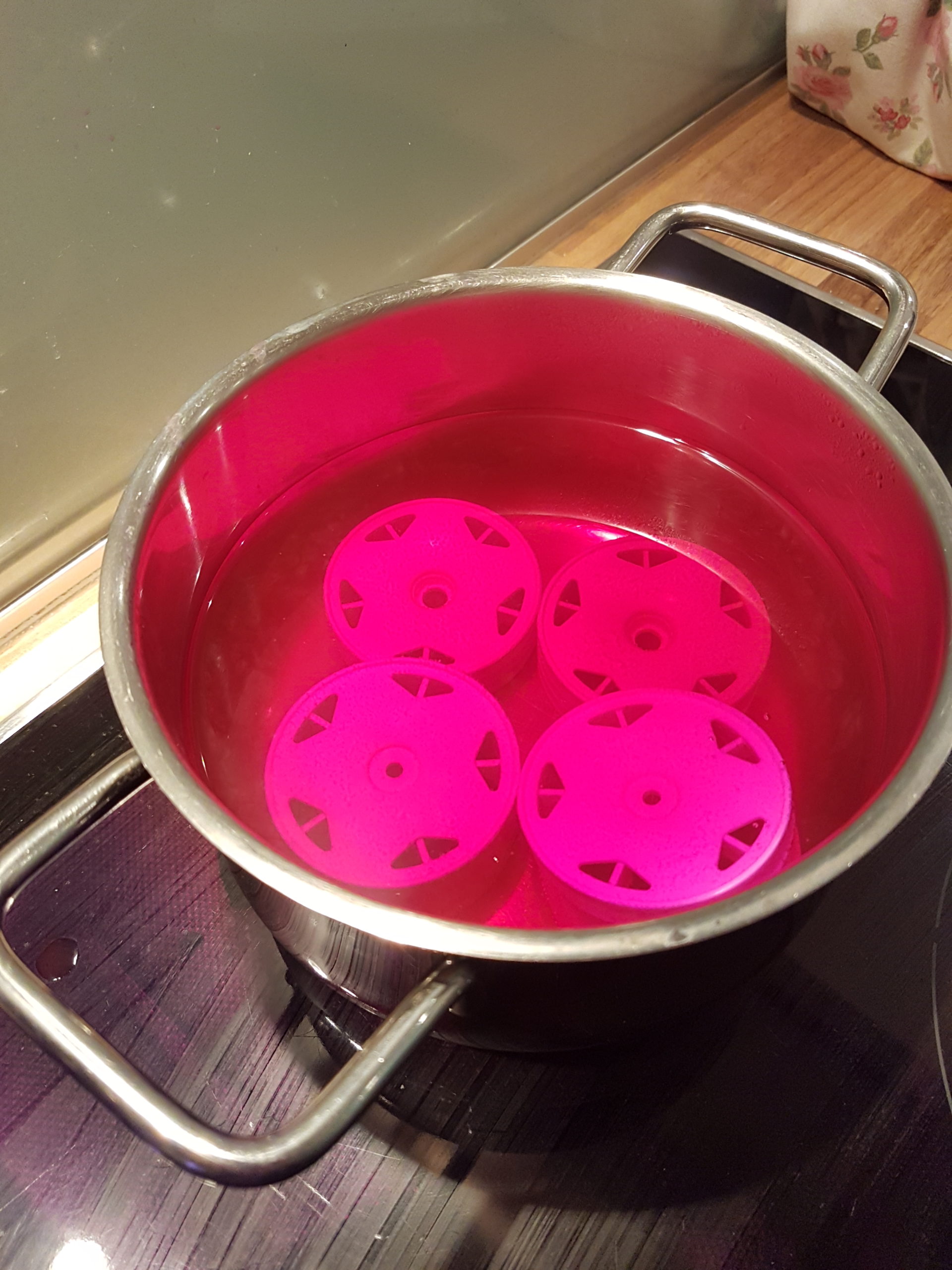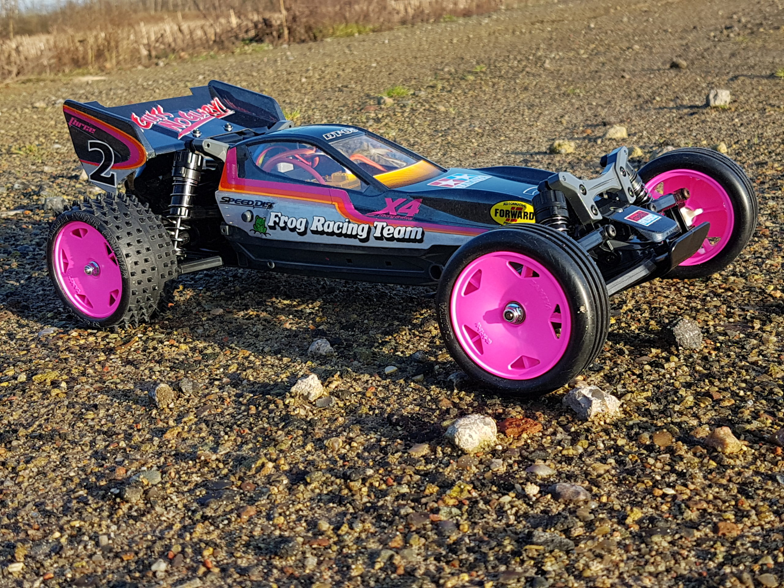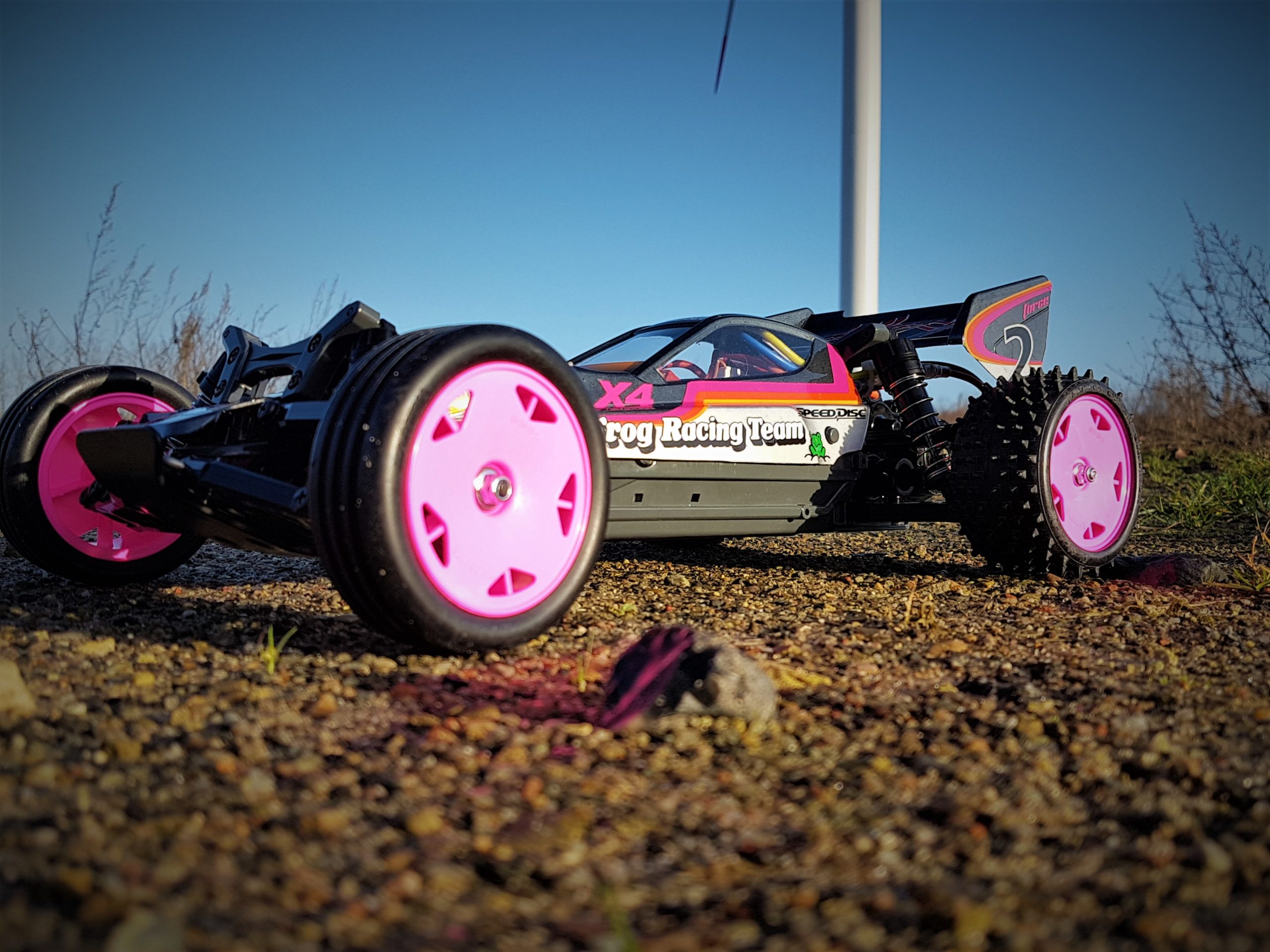 While thinking about how we want to paint our Neo-Fighter, we looked dreamily into our showcase with the old Tamiya buggies and saw the good old “Nylon Parts Coloring Set” by Tamiya (53130). We knew then: the rims had to turn pink! We quickly came up with the “Black Avante” from Tamiya and it was clear that the body should be painted in a combination of silver (Tamiya PS-12) and gun metal (Tamiya PS-23). Looking for suitable pink decals, we looked through our stock and suddenly held the Vaillant Decal-sheet from the 1/10 Porsche 934 Turbo RSR in our hands. The color of the decorative strips was perfect and could easily be adapted to the Neo-Fighter Body.